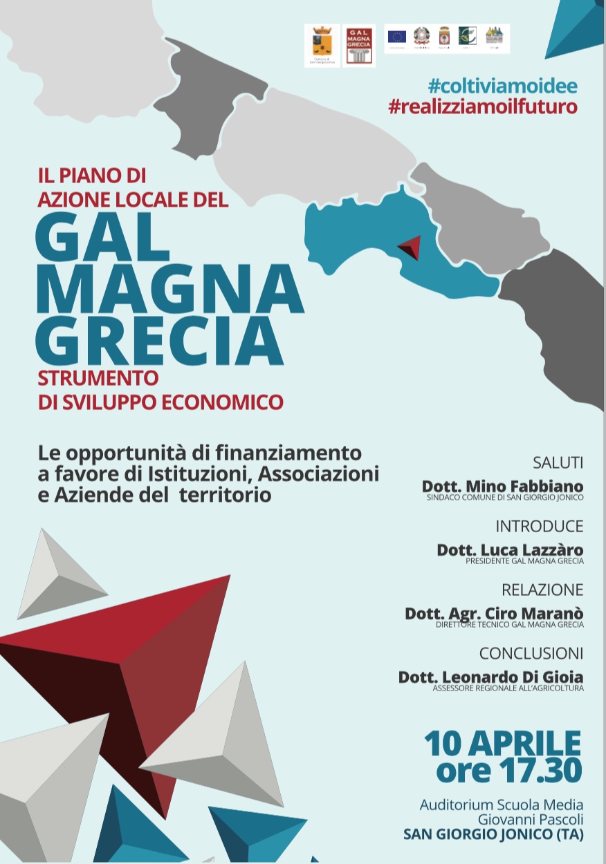 Il primo incontro pubblico “Il Piano Di Azione Locale del GAL Magna Grecia: strumento di sviluppo economico” si terrà, alle ore 17.30 di martedì 10 aprile, presso l’Auditorium della Scuola Media “Giovanni Pascoli”, in via IV Novembre a San Giorgio Jonico.