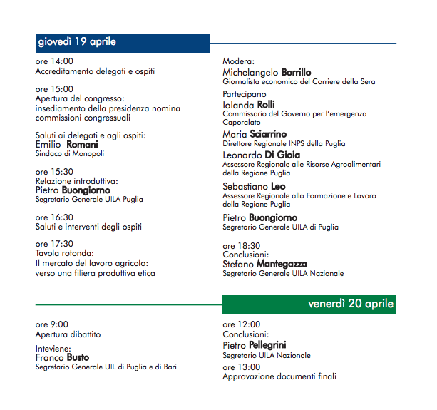 La seconda giornata, nella mattinata di venerdì 20 aprile, vedrà l’intervento del neo Segretario Generale della Uil di Puglia Franco Busto e si articolerà con il dibattito fra i delegati, l’approvazione del documento finale e l’elezione dei nuovi organismi dirigenti dell’organizzazione sindacale. Concluderà il congresso il Segretario Nazionale della Uila, Pietro Pellegrini.