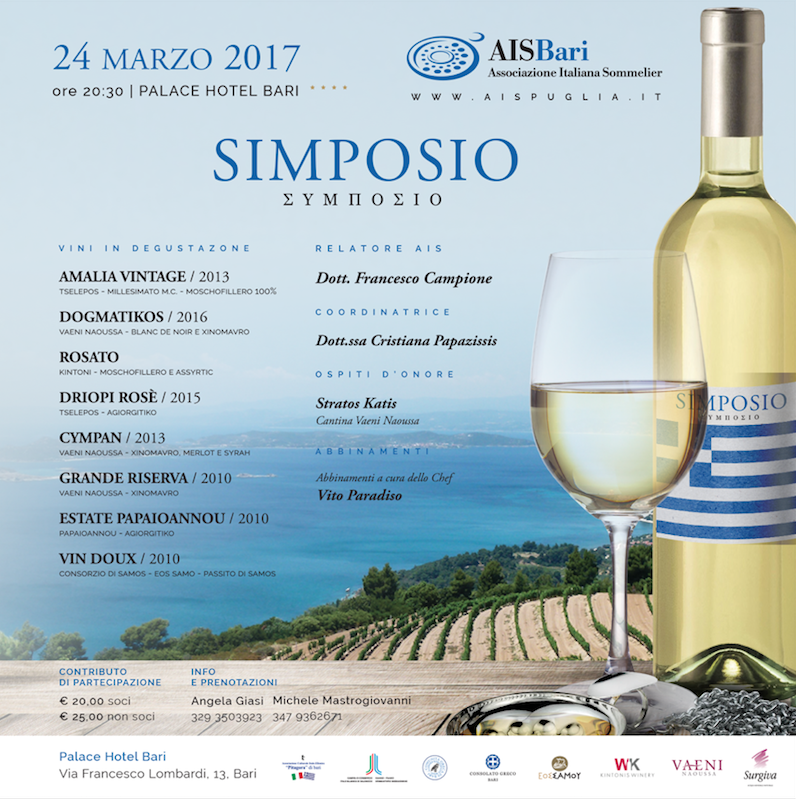 L’AIS Bari vi invita ad un Simposio sull’enologia greca, venerdì 24 marzo all’Hotel Palace alle ore 20.30.