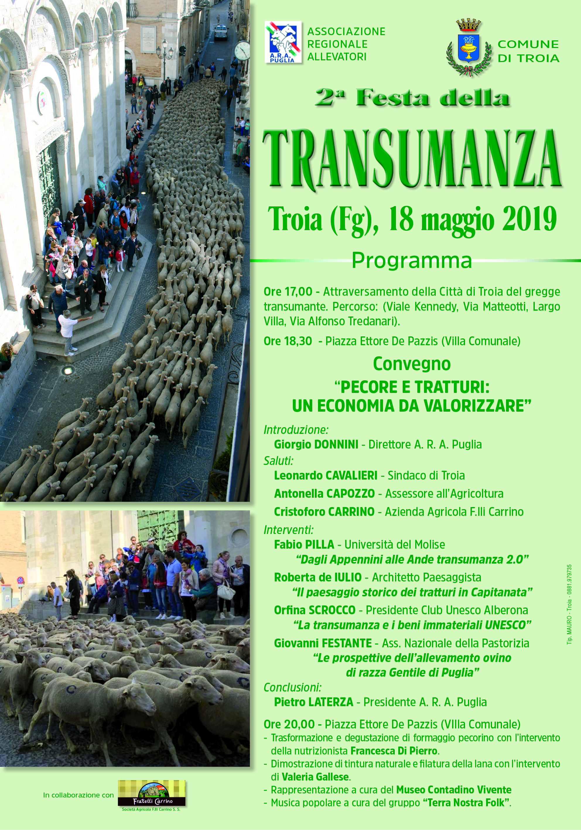 L’iniziativa è organizzata dalla Associazione Regionale Allevatori della Puglia e dal Comune di Troia nell’anno decisivo in cui sarà valutata dall’UNESCO la candidatura della Transumanza, per il suo valore culturale, a patrimonio immateriale della umanità.