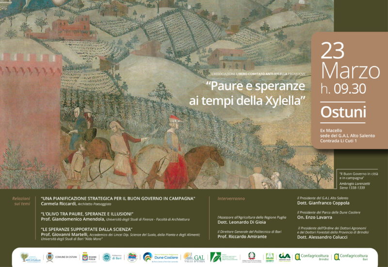Questo incontro affronta i drammi e le paure prodotte dalla Xylella in Puglia e la necessità di dare prospettive di ricostruzione e rinascita dei nostri territori agrari e rurali storici.