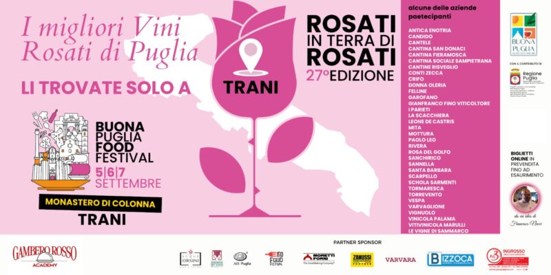 Dopo il successo dello scorso luglio a Lecce, la kermesse “Rosati in Terra di Rosali”, giunta alla sua 27esima edizione e organizzata dall’Associazione Buona Puglia – Gusto da visitare in collaborazione con Città del Gusto Gambero Rosso Lecce e con il patrocinio della Regione Puglia, si trasferisce a settembre nel nord della regione. E’ infatti a Trani, nella suggestiva cornice del Monastero di Colonna che si svolgerà la seconda tappa della manifestazione dedicata ai vini rosati.