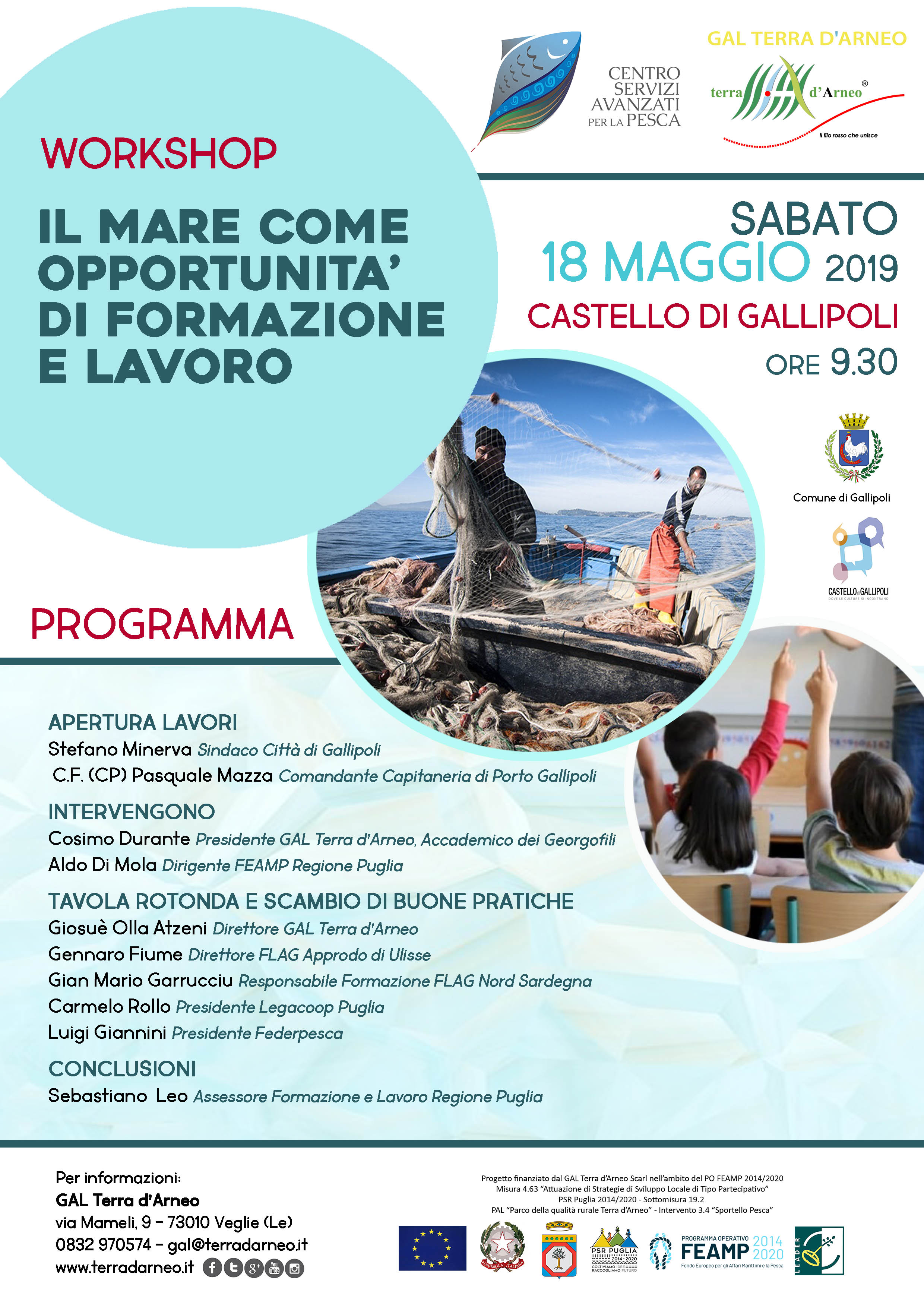 Di questi temi si occuperà il primo workshop a cura del GAL Terra d’Arneo in programma per Sabato 18 Maggio p.v. al Castello di Gallipoli. L’appuntamento, destinato agli Istituti Scolastici della Terra d’Arneo e agli imprenditori ittici che operano nei Comuni del GAL facenti parte del Compartimento Marittimo di Gallipoli, si configura come il primo di una serie di appuntamenti destinati a favorire il confronto tra i protagonisti dei settori della pesca, le scuole del territorio e tutte le istituzioni che concorrono, ognuna a suo modo, ad imprimere cambiamenti positivi sulla gestione della risorsa blu.